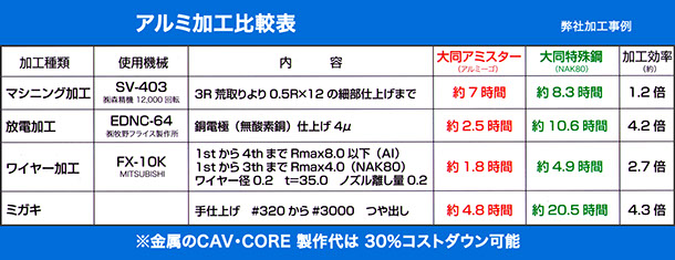 アルミ製金型は従来の鉄製に比べて熱伝導率が高いため、成形サイクルが早く、加工しやすく、2〜7割短縮でき、コストを3分の1ほどに抑えられます。アルミの比重は鉄のおよそ3分の1でで運搬が楽なのが利点。アルミは軟らかく強度では鉄に劣るとされますが、アルミ製金型でも1〜2万個は製品を問題なく製造できる耐久性があります。多品種少量生産や試作品用の需要に応えられます。